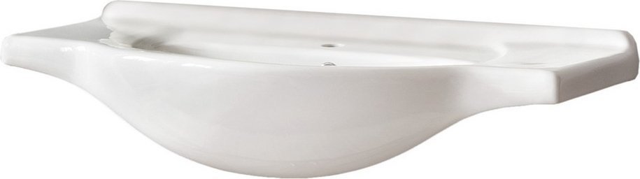 Porslinstvättställ med mjuka inbjudande former. Dess bakre kant är upphöjd för att vatten inte ska rinna bakom skåpet och bredvid tvättställsblandaren (ingår ej) finns bra avställningsyta för handtvål eller dylikt.