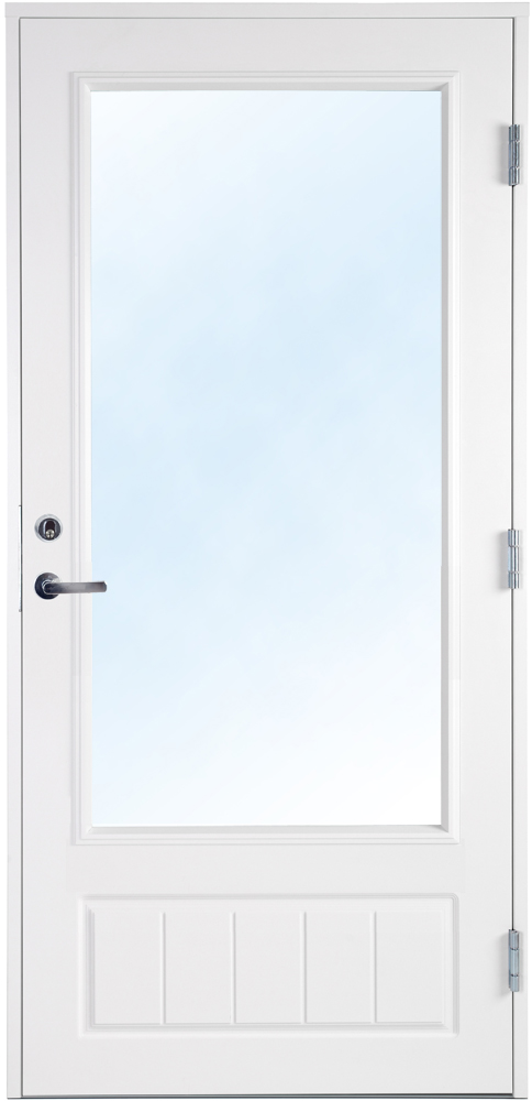 Dörren är dekorerad nedtill på både in- och utsida. Fönstret är en 2-glas isolerruta med Argon vilket ger ett lågt U-värde. Fönstret är på denna dörr av säkerhetsglas, vilket Boverket rekommenderar för glasrutor lägre än 60 cm från marken.