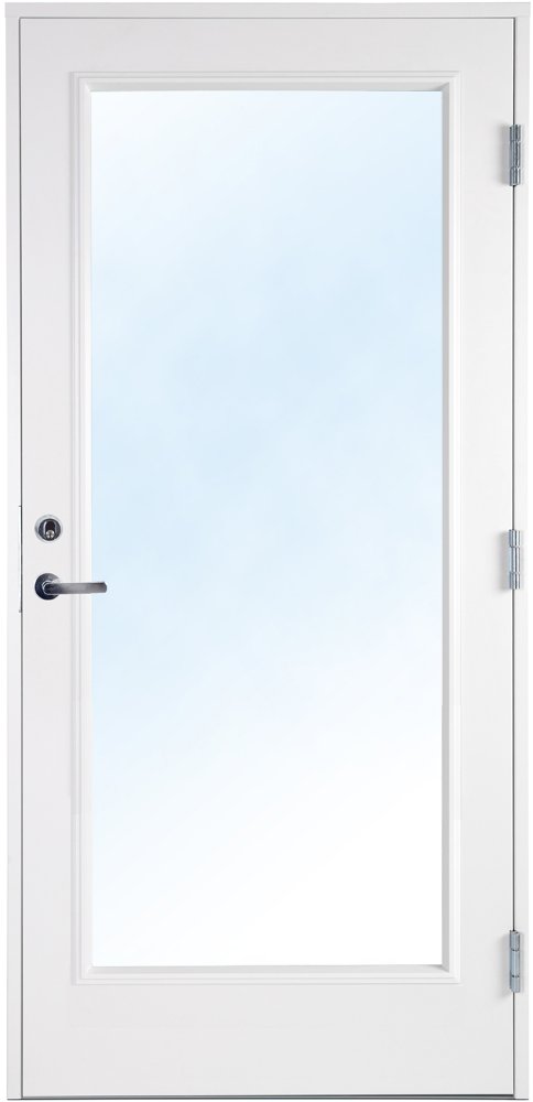 Dörren är dekorerad nedtill på både in- och utsida. Fönstret är en 2-glas isolerruta med Argon vilket ger ett lågt U-värde. Fönstret är på denna dörr av säkerhetsglas, vilket Boverket rekommenderar för glasrutor lägre än 60 cm från marken.