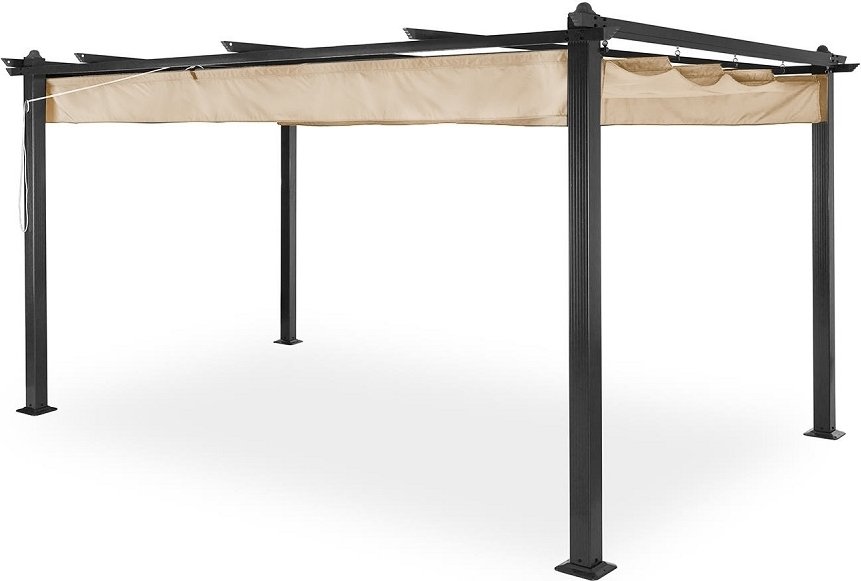 En stilren och funktionell pergola som ger skön skugga och skydd på uteplatsen. Konstruktionen är tillverkad i pulverlackerad aluminium med en mörkgrå finish, vilket ger både stabilitet och ett modernt utseende. Takduken i beige polyester är belagd med PU, vilket gör den vattenavvisande samtidigt som den ger effektivt solskydd.