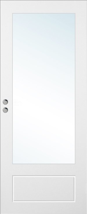 Målad kompakt skjutdörr med spårfräst dekor och glasruta för mycket ljusgenomsläpp.